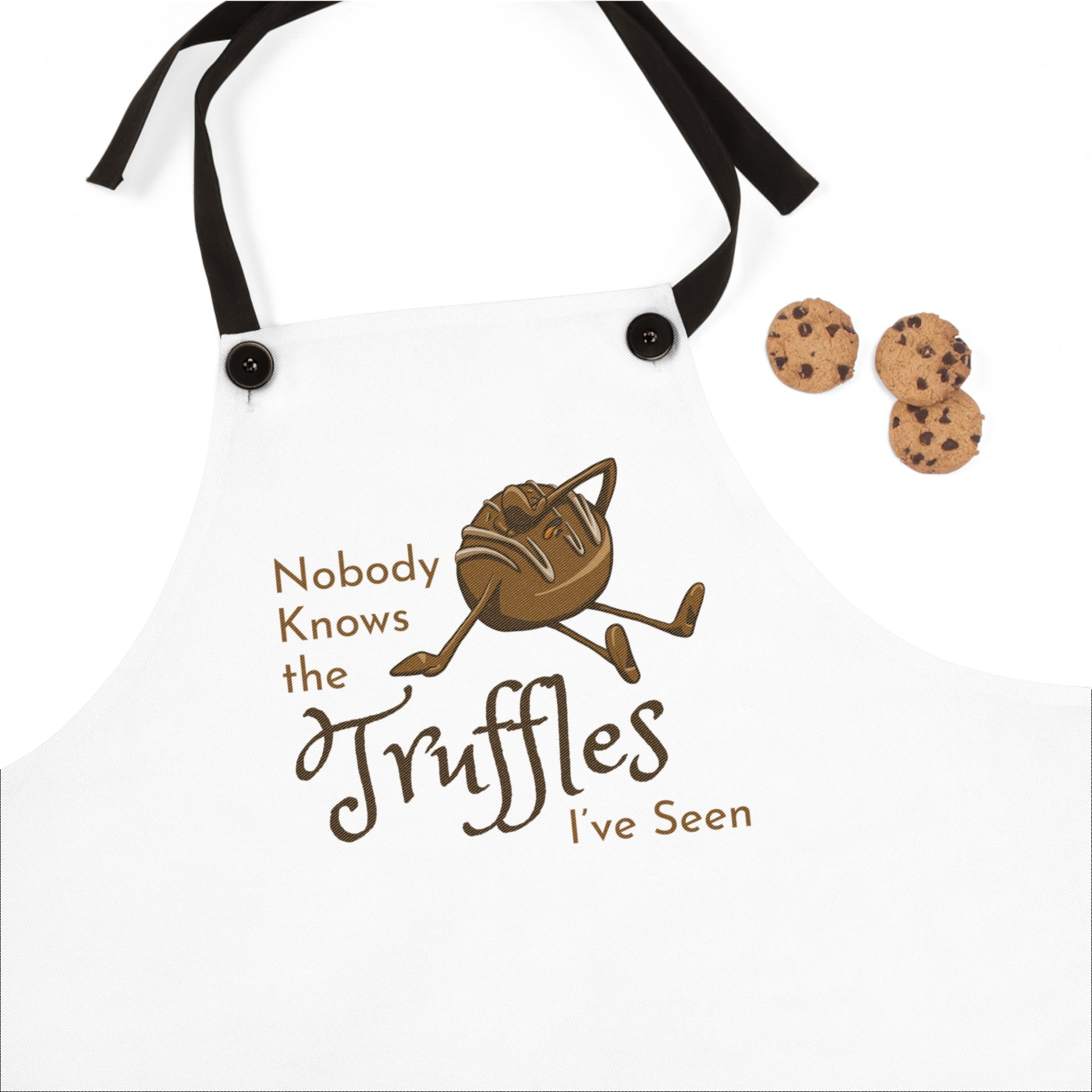 A fun and functional apron perfect for hosting parties or enjoying snacks at home. The one-sided print features a playful "Nobody Knows the Truffles I've Seen" design. This apron is relevant for home cooks, party hosts, and food enthusiasts, fitting into their everyday cooking and hosting routines. Perfect for occasions like game nights, movie marathons, and casual gatherings.